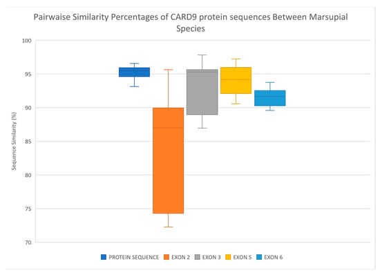 Box plot illustrating the spread of sequence similarity percentages for the five marsupial species examined through pairwise comparison of CARD9 protein sequences (region p1–320; Dark Blue), and CARD9 genomic sequences for exon 2 (Orange), exon 3 (Grey), exon 5 (Yellow), and exon 6 (Light Blue). Species compared: koala (Phascolarctos cinereus), common brushtail possum (Trichosurus vulpecula), grey short-tailed opossum (Monodelphis domestica), Tasmanian devil (Sarcophilus harrisii), and common wombat (Vombatus ursinus).