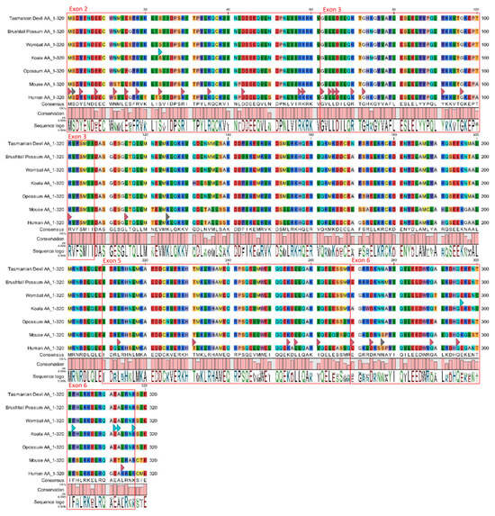 Pairwise comparison of predicted amino acids 1 to 320 amongst the seven species (koala, human, mouse, common wombat, Tasmanian devil, opossum, and brushtail possum) (Figure 5) showed percentage similarities ranging 80–97%. Sequence similarities were reflective of taxonomic relationships with human and mouse sequences, demonstrating low percentage similarities when compared with each of the five marsupial species (80–81%) and closely related species such as the koala and wombat showing a high degree of similarity (97%). Overall, the protein sequences between species were more similar, and similarity scores were less variable (range 3.44%) than the genomic sequences for each corresponding exon (Figure 4).
