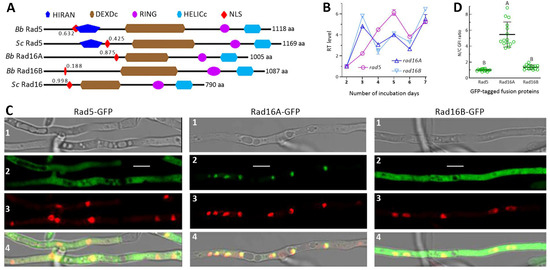 Recognition of Rad5, Rad16A and Rad16B in B. bassiana. (A) Comparison of domain architectures for Rad5 and Rad16 homologs of B. bassiana (Bb) and S. cerevisiae (Sc). Associated with each NLS motif is the maximal probability (decimal value) predicted. (B) Relative transcript (RT) levels for rad5, rad16A and rad16B expressed in the WT strain during 7-day incubation (versus day 2) on SDAY at 25 °C and 12:12 (L/D) photoperiod. (C) Laser scanning confocal microscopic images (scale: 5 μm) for subcellular localization of Rad5-GFP, Rad16A-GFP and Rad16B-GFP, which were expressed in the WT hyphae stained with DAPI. The bright, expressed (green), stained (red) and merged views of each microscopic field are shown in images 1, 2, 3 and 4, respectively. (D) N/C-GFI ratios of Rad5-GFP, Rad16A-GFP and Rad16B-GFP fusion proteins. Different uppercase letters denote a significant difference of p < 0.01 (Tukey’s test). Error bars: standard deviations (SDs) from three cDNA samples (C) or 15 hyphal cells (D) analyzed.