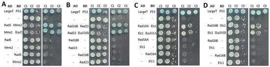 Y2H assays for protein–protein interactions. (A–D) Interactions of Rad5 (E3 ubiquitin ligase) with Mms2 (E2 ubiquitin-conjugating enzyme), Rad16B with Rad23, and Rad16A and Rad16B with the Elc1-like E3 ubiquitin ligase. The constructed diploids during 3 days of incubation at 30 °C grew as well as positive control on quadruple-dropout plates (right in each image) after inoculation with 5 × 102 (C3), 5 × 103 (C2) and 5 × 104 (C1) cells.