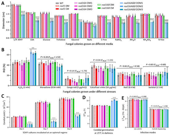 Roles of Rad5, Rad16A and Rad16B in B. bassiana lifecycle. (A) Diameters of fungal colonies (DM, deletion mutant; DDM, double-deletion mutant; CM, complementation mutant) incubated at the optimal regime of 25 °C and 12:12 (L/D) for 7 days on the plates of 1/4 SDAY, CDA and CDAs amended with different carbon or nitrogen sources. (B) Relative growth inhibition (RGI) of fungal colonies after 7-day incubation at 25 °C on CDA plates containing indicated concentrations of different chemical stressors. The colony growth was initiated with ~103 conidia. (C) Conidial yields in the SDAY cultures incubated for 5, 7 and 9 days at the optimal regime after each culture was initiated by spreading 100 μL of conidial suspension (107 conidia/mL). (D) Estimates of GT50 as an index of conidial viability. (E) Estimates of LT50 as a virulence index of fungal strains against G. mellonella larvae through normal cuticle infection or cuticle-bypassing infection (intrahemocoel injection). p < 0.01 ** or 0.001 *** in Tukey’s test. Error bars: SDs from three independent replicates.