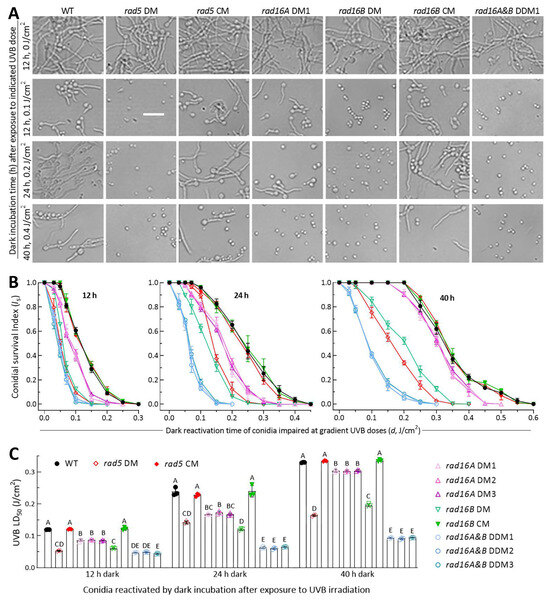 Almost all conidia produced via the DM, DDM and control strains germinated after 12 h dark incubation at the optimal 25 °C (Figure 4A). The control strains’ conidia were largely reactivated (germinated) at the end of 12 h of dark incubation after exposure to a UVB dose of 0.1 J/cm2 or of 24 h of dark incubation after exposure to 0.2 J/cm2; however, the conidia were less reactivated at the end of 40 h of dark incubation after exposure to 0.4 J/cm2. The dark-reactivated conidia were observable for rad16A DM, but hardly observed for the other DM and DDM strains, after exposure to 0.1 or 0.2 J/cm2. For all DM and DDM strains, the conidia impaired at 0.4 J/cm2 were not reactivated at all through 40 h of dark incubation.