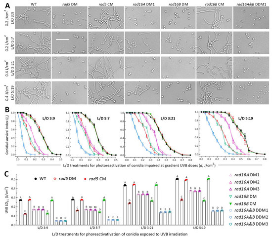 Comparative activities of Rad5, Rad16A and Rad16B in photoreactivation of B. bassiana conidia irradiated at gradient UVB doses. (A) Microscopic images (scale: 20 μm) for germination status of UVB-impaired conidia incubated at 25 °C for a total of 12 or 24 h in L/D 3:9, 5:7, 3:21 and 5:19 post-irradiation at 0.2 or 0.4 J/cm2, respectively. (B) Trends of conidial survival indices photoreactivated in the L/D treatments after conidia were irradiated at gradient UVB doses. (C) LD50 values estimated as an index of photorepair activity from the survival trends fitted in different L/D treatments. Different uppercase letters denote significant differences of p < 0.01 (Tukey’s HSD). Error bars: SDs from three independent replicates.