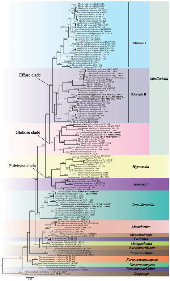 Three-gene (nrLSU, tef-1α, and rpb1) sequences were generated from eight specimens and two living cultures (see Table 1). Three-gene sequences of 129 samples from 14 genera in the family Clavicipitaceae were used for the ML and BI phylogenetic analyses. Pleurocordyceps aurantiaca MFLUCC 17-2113 and Pleurocordyceps marginaliradians MFLU 17-1582 were used as the outgroups. The concatenated three-gene sequences contained 2726 bp (nrLSU: 935 bp, tef-1α: 1024 bp, and rpb1: 767 bp). Both the ML and BI analyses exhibited nearly consistent overall topologies. The results of the phylogenetic analysis showed three highly supported clades, viz., the Pulvinate clade (BP = 100%, PP = 1), the Globose clade (BP = 100%, PP = 1), and the Effuse clade (BP = 100%, PP = 1) (Figure 1). The Effuse clade was segregated into two sister clades, subclade I and subclade II. Moelleriella contains the Effuse clade and the Globose clade. Two new species of Moelleriella were distributed in the Effuse clade (M. longzhuensis) and the Globose clade (M. jinuoana). Three samples of M. longzhuensis were clustered closely with M. rhombispora (M. Liu & K.T. Hodge) M. Liu & P. Chaverri and formed a monophyletic clade in the Effuse clade with a high level of statistical support (BP = 100%, PP = 1). Three samples of M. jinuoana formed a monophyletic clade in the Globose clade with a high level of statistical support (BP = 91%, PP = 0.8). The genus Conoideocrella was clustered with Orbiocrella and had a new species (C. fenshuilingensis) and one known species (C. tenuis). Two samples of C. fenshuilingensis formed a monophyletic clade in Conoideocrella with a high level of statistical support (BP = 100%, PP = 1).