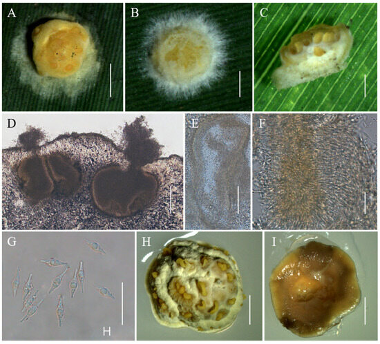 Morphology of Moelleriella longzhuensis. (A–C) Anamorphic stromata containing conidiomata; (D,E) Section of stromata showing conidiomata; (F) Phialides with conidia at the tips; (G) Conidia; (H) Obverse of colonies on PDA at 25 °C after 21 days; (I) Reverse of colonies on PDA at 25 °C after 21 days. Scale bars: 1 mm (A); 0.5 mm (B,C); 50 µm (D); 100 µm (E); 20 µm (F,G); and 2 mm (H,I).