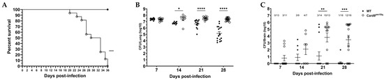 C. neoformans 52D. Relative to 14 DPI, the fungal burden of Balb/c mice was significantly reduced at 21 DPI and was 100-fold lower at 28 DPI, while no reduction was observed in Card9