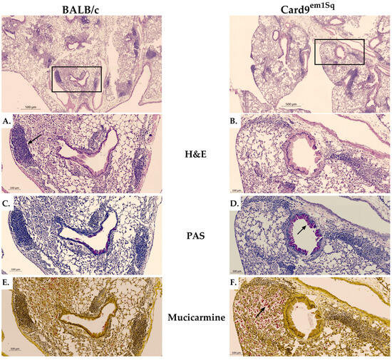 C. neoformans in association with clear evidence of airway goblet cell metaplasia and mucus production in lung sections of Card9
