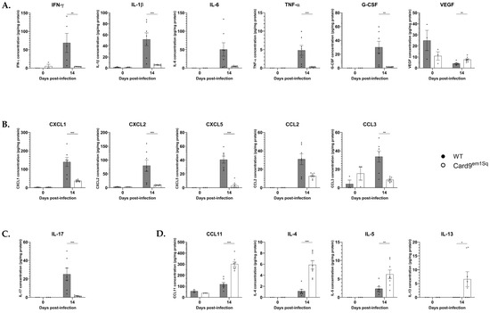 40]. To evaluate these possibilities, fungal burden was quantified in the lungs and brain as a marker of local and disseminated infection, respectively. The pulmonary fungal burden was comparable between Card9