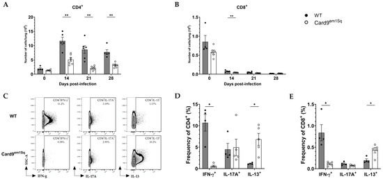 Defective cellular immunity is a major risk factor for progressive and/or disseminated cryptococcal infection and is most commonly observed with HIV infection and other immunosuppressive conditions that impair the number and/or function of CD4+ T lymphocytes. To determine whether Card9 deficiency alters the pattern of lung immune cell recruitment, flow cytometry was performed at serial time points after C. neoformans infection. Compared to the Balb/c strain, Card9em1Sq mice recruited fewer CD4+ T lymphocytes to the lung from 14–28 DPI. Phenotypic characterization by intracellular cytokine staining showed a higher and lower frequency of Il-13+ CD4+ and Ifnγ+ CD4+ cells in Card9em1Sq compared to Balb/c mice, respectively.