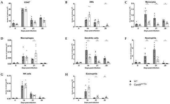 52]. Card9 is mainly expressed by cells of the myeloid lineage; accordingly, recruitment of these cells was analyzed at serial time points after cryptococcal infection. Card9