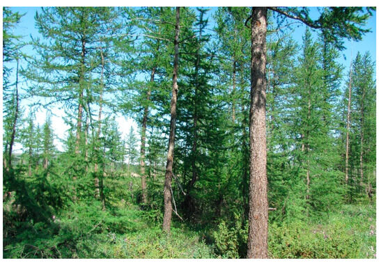- Abaimov, A.P. Larch Forests and Woodlands of Northern Siberia: Diversity, Ecology and Forest Forming Process. Ph.D. Thesis, Sukachev Institute of Forests, Krasnoyarsk, Novosibirsk, Russia, 1997. [Google Scholar]
