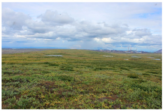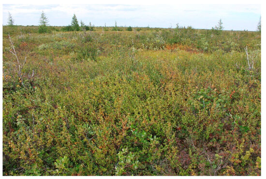 Research plot IV. Tundra covered by shrubs, subshrubs, and sedges. The research plot is located 6 km north of Talnakh and 23 km northeast of Norilsk: on the second above-floodplain terrace of the Kharaelakh River valley. The relief is represented by a gentle (3–4°) northwestern slope. The research plot IV is located 163 m above sea level (Figure 4).