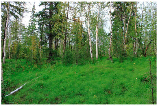 Research plot III. Birch–spruce–larch forest. The field layer is dominated by horsetail ferns (mostly, Equisetum pratense). The research plot is located 1.5 km southeast of Talnakh and 15 km northeast of Norilsk: on the watershed of the Talnakh and Listvyanka rivers. There are both hills and lowlands on the research plot. Surface depressions are swampy or filled with thermokarst lakes. The research plot III is located 46 m above sea level (Figure 3).