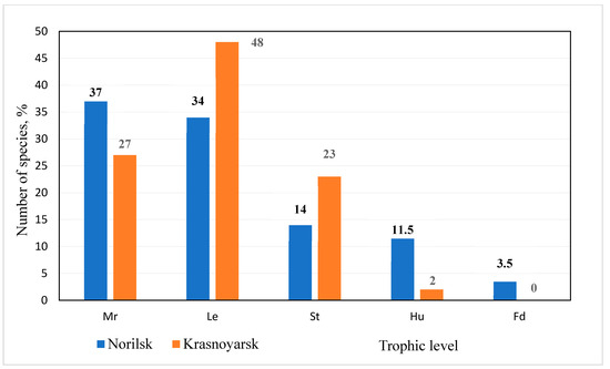Figure 5 shows a relative distribution of macromycete species (identified near Norilsk) by trophic-level groups. We also suggest using data on the trophic structure of macromycetes in the southern taiga forests (near Krasnoyarsk) for comparative analysis [42].