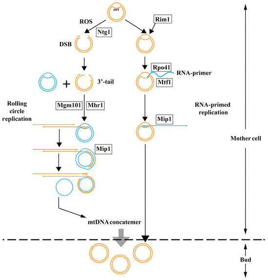 Model of mtDNA replication in yeast. In rolling circle replication (left), ROS attack the ori region and this leads to a DSB together with Ntg1. The 3′-tail forms subsequently and combines with another ori region with the action of Mhr1 and Mgm101, and rolling circle replication proceeds with Mip1. The mtDNA concatemer then moves to the bud. In RNA-primed replication (right), single-stranded DNA is stabilized by Rim1.
