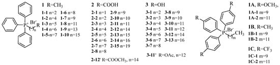 With the exception of esters 2–12′ and 3–11′, all compounds were readily synthesized via nucleophilic substitution of triphenylphosphine with brominated starting materials. The electronic impact of substituents on the benzene ring significantly influenced the yield. For example, tris(4-trifluoromethyl-phenyl)phosphine only produced a 10% yield of the corresponding phosphonium compound, even when the reaction time was extended to 24 h. Nevertheless, we did not optimize the reaction conditions as it was deemed non-essential.