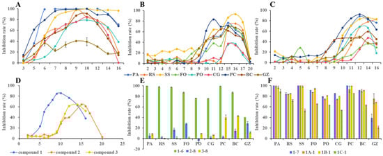 Due to the potent and broad-spectrum fungicidal effects observed against plant pathogens, compounds 1–7 and 1–8 underwent additional assessment for their plant safety and potential as agricultural fungicides. However, the data depicted in Figure 7 reveal that at a concentration of 100 μg/mL, both 1–7 and 1–8 inflicted significant damage on rape leaves and induced minor phytotoxicity on pepper leaves. Therefore, the direct utilization of these compounds as agricultural fungicides is not recommended.