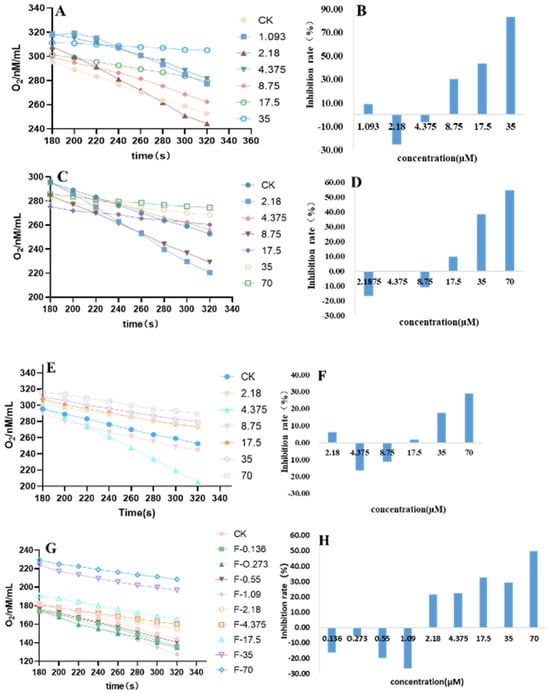 Respiratory curve ((A) 1–8; (C) 2–12; (E) 3–11; (G) fluazinam) and respiratory inhibition rate ((B) 1–8; (D) 2–12; (F) 3–11; (H) fluazinam) of P. capsici mycelia after treatment with agent.