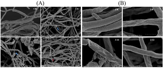 Changes in the mycelial morphology of P. capsici after treatment with blank, 35 μM 1–8, 2–12, and 3–11 ((A) 1000 K; (B) 5000 K).