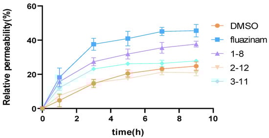 The impact of the compounds on the conductivity of P. capsici mycelia were evaluated at a concentration of 17.5 μM, with DMSO (2‰) used as the blank control. The findings are detailed in Table S1 and represented in Figure 6. It was noted that the relative permeability of the mycelium substantially increased within the initial 1–5 h after the agent’s introduction. During this period, the relative permeability of 1–8 escalated from 15.65% to 31.85%, 2–12 from 7.50% to 17.54%, and 3–11 from 12.15% to 26.18%. Subsequently, the seepage velocity gradually declined, reaching a steady state. By the 9 h mark, the final relative permeabilities for compounds 1–8, 2–12, and 3–11 were recorded as 37.67%, 20.94%, and 27.83%, respectively. It is noteworthy that these values were all inferior to the control drug fluazinam (45.55%). Furthermore, the 2‰ DMSO led to a rise in relative permeability, consistent with prior reports [38]. Compound 2–12 exhibited a relative permeability effect on the mycelium akin to the DMSO control, significantly lower compared to compounds 1–8 and 3–11, consistent with the previous fungicidal activity results.