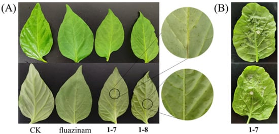 Phytotoxicity of compounds 1–7 and 1–8. (A) Pepper leaves (sprayed 100 µg/mL solution of 1–7 or 1–8 and then cultured for 7 d). (B) Rape leaves (sprayed 100 µg/mL (top) and 200 µg/mL (bottom) solution of 1–7 and then cultured for 24 h).