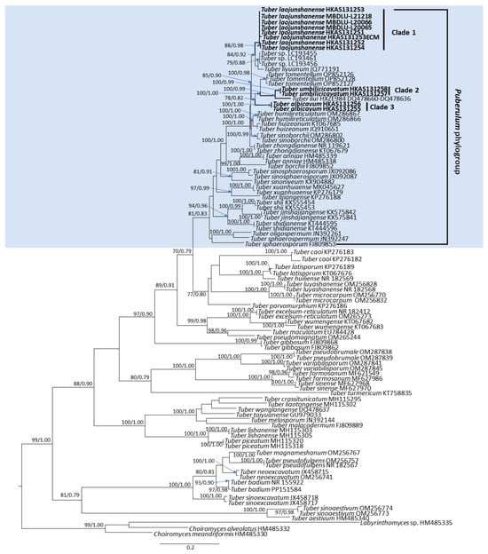 In the phylogenetic tree, the 99 ITS sequences from Tuber ascomata revealed the phylogenetic relationship of 54 species: Clade 1 includes seven sequences of new species T. laojunshanense ascomata and one sequence of ectomycorrhizae formed by T. laojunshanense and Abies forrestii var. smithii from China. Clade 2 includes two sequences of new species T. umbilicicavatum from China. Clade 3 includes three sequences of new species T. albicavum from China. They belong to the Puberulum phylogroup. We selected the sequences of similar species of the genus Tuber distributed in China, and the sequences of species belonging to the Puberulum phylogenetic group for phylogenetic analysis with our collected specimens. The phylogenetic analysis showed that the new species are distinct from other Tuber species. In addition to the ITS sequences used in this phylogenetic analysis, the LSU sequences were amplified from the newly supplemented specimens in this study and uploaded to NCBI for future study.