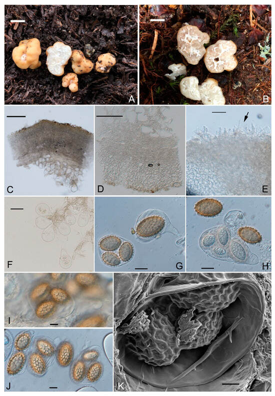 Tuber laojunshanense, (A,B) ascomata and gleba; (C,D) a piece of the section of peridium in 5% KOH; (E) peridium outer layer in 5% KOH, the black arrows indicating hyphae extending beyond the surface; (F) asci with immature ascospores in 5%KOH; (G) ascus contains 1 spore or 3 spores when mature; (H) released ascospores and asci; (I,J) asci and ascospores; (K) SEM ascospores (dry sample). Scale bars: A,B = 1 cm; C,D = 100 μm; E = 10 μm; F = 50 μm; G–K = 10 μm.