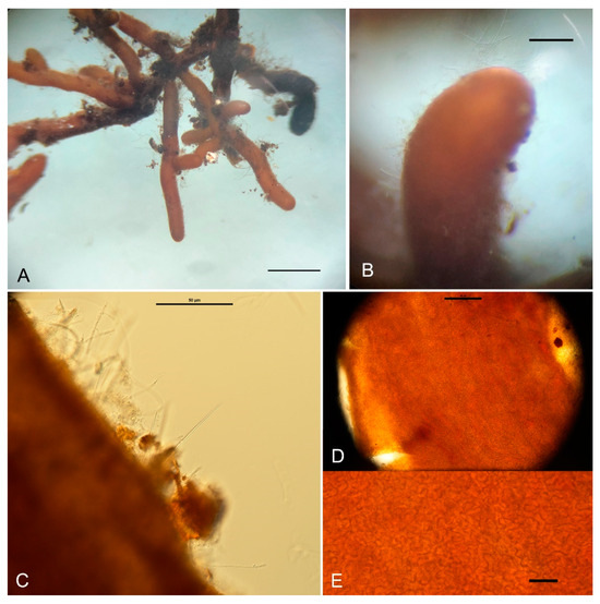 Ectomycorrhizae of T. laojunshanense with Abies forrestii var. smithii. (A) Mycorrhizal clusters; (B) a mycorrhizal tip with spiky cystidia; (C) spiky cystidia arising from the cells of the outer mantle layer; (D,E) mantle surface structure. Scale bars: A = 0.5 cm; B = 1 mm; C,D = 50 μm; E = 20 μm.