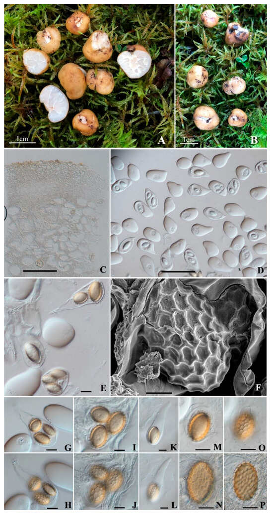 Tuber umbilicicavatum, (A,B) ascomata; (C) a piece of the section of the ascomata in 5%KOH; (D) asci in lactophenol; (E) 1-spored, 2-spored, and 4-spored asci; (F) SEM ascospores (dry sample); (G–P) ascospores and ascus; Scale bars: A,B = 1 cm; C,D = 100 μm; E,G–P = 20 μm; F = 10 μm.