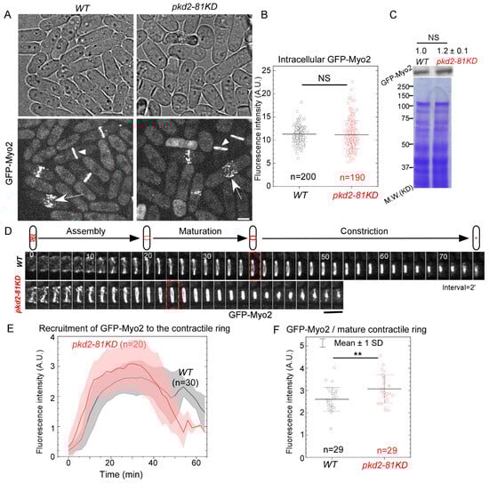The pkd2-81KD mutant increased the recruitment of myosin II heavy chain Myo2 to the contractile ring. (A) Micrographs of wild type and pkd2-81KD cells expressing GFP-Myo2. White arrow: cytokinetic nodes; White arrowhead: the contractile ring. (B) Dot plot of the average intracellular fluorescence intensity of GFP-Myo2 in a cell. (C) Top: anti-GFP blot of the lysate from wild type and pkd2-81KD cells expressing GFP-Myo2. Number indicates the normalized intensity of GFP-Myo2 band ± standard deviations. Bottom: Coomassie blue stained SDS-PAGE gel of respective lysates. Representative data from three biological repeats are shown. (D) Top: a diagram of the contractile ring assembly, maturation and constriction in a fission yeast cell. Bottom: time series of the equatorial plane of dividing cells expressing GFP-Myo2. Dashed box: start of the contractile ring constriction. Number: time in minutes. (E) Time course of the fluorescence intensity of GFP-Myo2 at the equatorial plane after the start of contractile ring assembly (time zero). Cloud: standard deviations. Interval = 2 min. (F) Dot plot of the fluorescence intensity of GFP-Myo2 in a mature contractile ring just before it starts to constrict. **: p < 0.01. NS: not significant. Statistics were calculated using two-tailed Student’s t tests. All the data are pooled from at least two independent biological repeats. Scale bar = 5 µm.