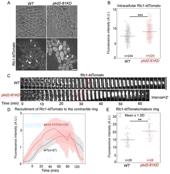 The pkd2-81KD mutant increased the recruitment of myosin II regulatory light chain Rlc1 to the contractile ring. (A) Micrographs of wild type and pkd2-81KD cells expressing Rlc1-tdTomato. White arrowhead: the contractile ring. (B) Dot plot of the intracellular fluorescence intensity of Rlc1-tdTomato in a cell. (C) Time series of the equatorial plane of dividing cells expressing Rlc1-tdTomato. Dashed box: start of the contractile ring constriction. Number indicates time in minutes. (D) Time course of the fluorescence intensity of Rlc1-tdTomato in the equatorial plane. Cloud: standard deviations. (E) Dot plot of the fluorescence intensity of Rlc1-tdTomato in a mature contractile ring. **: p < 0.01. ***: p < 0.001. Statistics were calculated using two-tailed Student’s t-tests. All the data are pooled from at least two independent biological repeats. Scale bar = 5 µm.