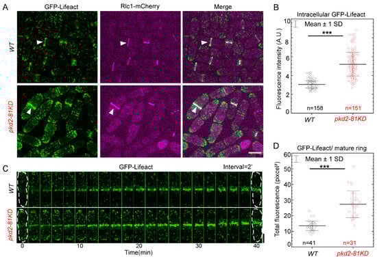 The pkd2-81KD mutation increased the assembly of actin filaments in the contractile ring. (A) Micrographs of the wild type (top) and pkd2-81KD (bottom) cells co-expressing GFP-Lifeact (green) and Rlc1-mCherry (magenta). White arrowhead: the contractile ring. (B) Dot plot of the average intracellular fluorescence intensity of GFP-Lifeact in a cell. (C) Time series of a wild type and a pkd2-81KD cell co-expressing GFP-Lifeact (green) and Rlc1-mCherry. Number: Time in minutes from the start of the contractile ring assembly based on the appearance of cytokinetic nodes marked by Rlc1-mCherry. (D) Dot plot of the total fluorescence of GFP-Lifeact in a mature contractile ring. ***: p < 0.001. Statistics were calculated using two-tailed Student’s t tests. All the data are pooled from three independent biological repeats. Bar = 5 µm.