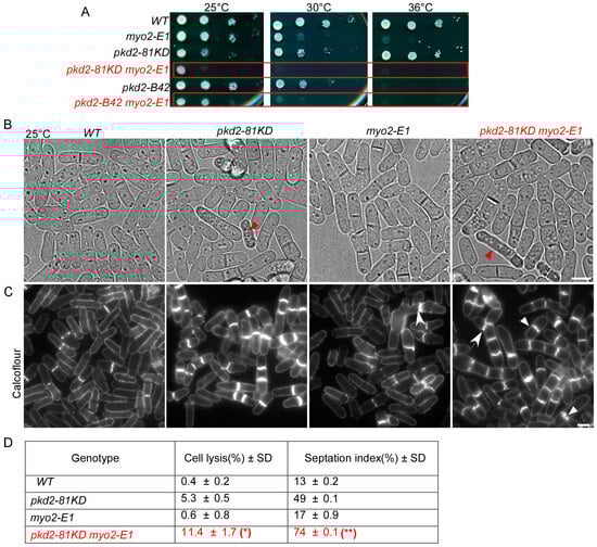 To further understand the relationship between pkd2 and myo2, we examined their interactions through genetic studies of pkd2 and myo2 mutants. First, we confirmed the previously discovered negative genetic interaction between pkd2-81KD and a temperature-sensitive mutant myo2-E1 (Figure 4A) [18]. Now, we similarly found a negative genetic interaction between the temperature-sensitive mutant pkd2-B42 [26] and myo2-E1 (Figure 4A). Even at the permissive temperature of 25 °C, the double mutant pkd2-B42 myo2-E1 grew much more slowly than either pkd2-B42 or myo2-E1 (Figure 4A). Next, we compared the morphology of pkd2-81KD, myo2-E1, and pkd2-81KD myo2-E1 cells with each other. Both pkd2-81KD myo2-E1 and pkd2-81KD cells appeared to be rounder than the wild type cells (Figure 4B). Both of them also contained a small fraction of “deflated” cells, which shrank temporarily even in the rich YE medium (Figure 4B). However, the pkd2-81KD myo2-E1 mutant stood out for its large fraction of lysed cells (11 ± 1.7%, average ± standard deviation) even at the permissive temperature of 25 °C, far more than either the pkd2-81KD or myo2-E1 mutant (Figure 4B). A much higher fraction of the double mutant (74%) contained septum than either of the single mutants (Figure 4C,D). The septum of pkd2-81KD myo2-E1 cells often appeared to be wavy, a rare phenotype among either of the single mutants (Figure 4C). Many more of the double mutant cells were multi-septated (21 ± 3%) than either pkd2-81KD or myo2-E1 cells (Figure 4D). Based on these genetic analyses, we concluded that pkd2 and myo2 have a synergistic relationship in cytokinesis.