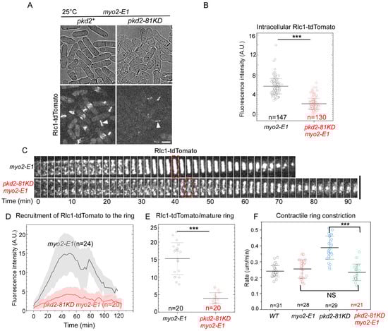 The pkd2-81KD myo2-E1 mutant failed to assemble a complete contractile ring at the permissive temperature. (A) Micrographs of live cells expressing Rlc1-tdTomato. Arrowhead: the contractile ring. (B) Dot plot of average intracellular fluorescence intensity of Rlc1-tdTomato in a cell. (C) Time-lapse series of the equatorial plane of a myo2-E1 and a pkd2-81KD myo2-E1 cell expressing Rlc1-tdTomato. Dashed box: start of contractile ring constriction. Number: time in minutes. (D) Time course of the fluorescence intensity of Rlc1-tdTomato at the equatorial plane. Interval = 2 min. (E) Dot plot of average fluorescence intensity of Rlc1-tdTomato in a mature contractile ring before it starts to constrict. (F) Dot plot of the rate of the contractile ring constriction. All the experiments were carried out at the permissive temperature of 25 °C. ***: p < 0.001. NS: not significant. Statistics were calculated using two-tailed Student’s t tests. All the data are pooled from at least two independent biological repeats. Scale bar = 5 µm.