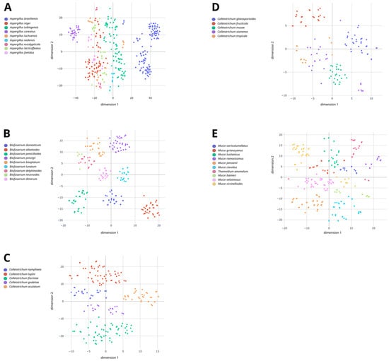 Figure 1. A two-dimensional t-SNE map displaying the spectra from the Aspergillus series nigri (A), the Bisifusarium dimerum complex (B), the Colletotrichum acutatum complex (C), the Colletotrichum gloeosporioides complex (D) and the Mucor circinelloides complex (E) obtained through MALDI-TOF MS. Spectra are colored according to the respective species to which they belong.