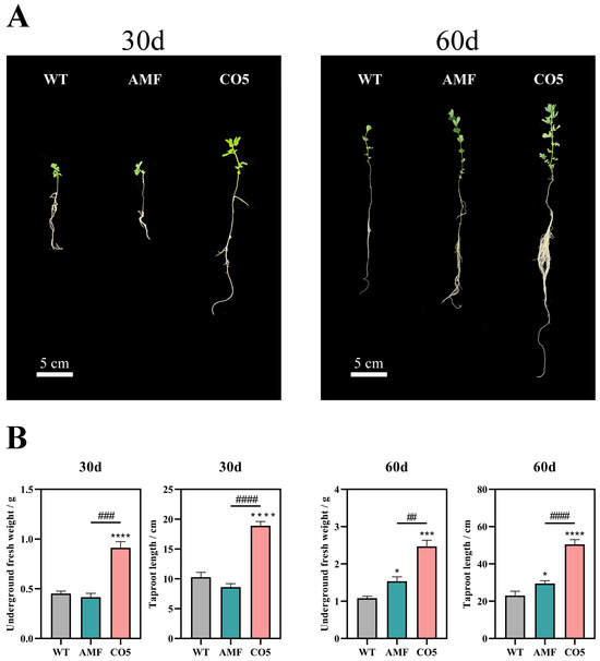 Analysis of the growth-promoting effects of CO5 on Lotus japonicus. (A) The effect of MyC factor analogue CO5 on Lotus japonicus. (B) Underground fresh weight and taproot length of Lotus japonicus at 30 and 60 days. * p < 0.05, *** p < 0.001 **** p < 0.0001; ## p < 0.01, ### p < 0.001, #### p < 0.0001 (n = 3, data are the means ± SEM).