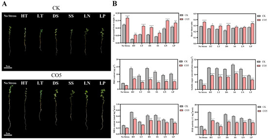To investigate the potential of CO5 in promoting the growth of Lotus japonicus under stress conditions, seven common stress treatments were applied, including high-temperature stress (HT), low-temperature stress (LT), drought stress (DS), high-salt stress (SS), low-nitrogen stress (LN), and low-phosphorus stress (LP). The results showed that the addition of CO5 effectively alleviated the growth inhibition of Lotus japonicus under these stress conditions. The relief was evident in the increased leaf number and root length observed in the CO5-treated plants (Figure 2A). Additionally, the underground fresh weight and root–shoot ratio of the CO5-treated group exhibited significant increases compared to the untreated group (Figure 2B). Furthermore, physiological indicators reflective of stress severity, including MDA, POD, PRO, and soluble sugars, were measured. The addition of CO5 was found to significantly reduce the levels of all four stress indicators (Figure 2B). Overall, the findings suggest that CO5 has the potential to enhance the stress resistance of Lotus japonicus under various stress conditions.