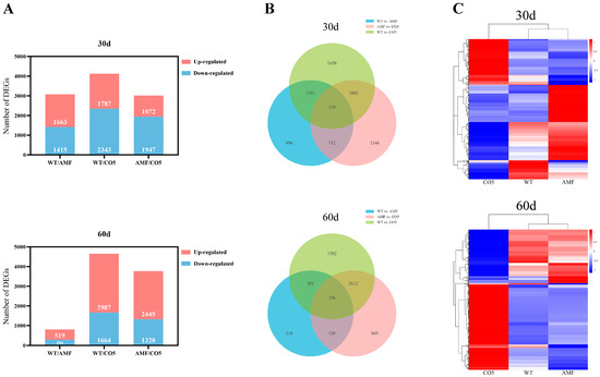 Dynamic changes and comparative analysis of DEGs. (A) Number of transcriptome expression changes in different comparison groups at different periods. (B) Number of DEGs between WT, AMF, and CO5. (C) Heat map of signaling pathways and related gene expression.