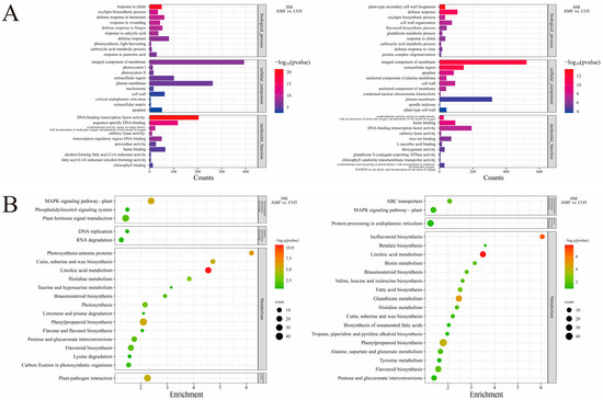 Gene ontology classification and Pathway Enrichment Analysis of DEGs. (A) The most enriched GO term of AMF and CO5. (B) The most enriched KEGG term of AMF and CO5.
