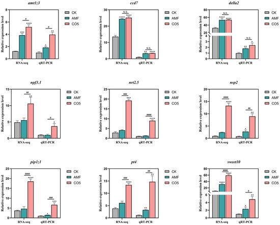 CO5 activates the symbiotic pathway, nitrogen and phosphorus absorption, and disease-resistant and stress-related gene expression. * p < 0.05, ** p < 0.01, *** p < 0.001, **** p < 0.0001; # p < 0.05, ## p < 0.01, ### p < 0.001, #### p < 0.0001 (n = 3, data are the means ± SEM).