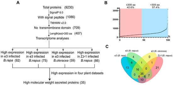 Prediction process and distribution of high-molecular-weight secreted proteins in P. brassicae. (A) Pipeline for the prediction of P. brassicae high-molecular-weight secreted proteins; numbers in parentheses indicate the number of proteins identified in each step. (B) Distribution of amino acids of putative secreted proteins. (C) Venn diagram of high-molecular-weight secreted proteins predicted to be highly expressed in e310-infected B. rapa, B. napus, and B. oleracea and ZJ-1 infected B. napus.