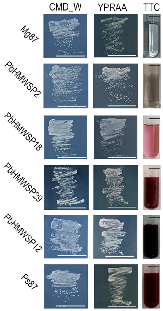 To confirm our signal peptide prediction results, the 35 putative PbHMWSPs were further investigated using a yeast signal sequence trap system to determine the secretory activities of their signal peptide sequences [42]. The results showed that the yeast strains containing the signal peptide sequences of 29 putative PbHMWSPs grew normally on YPRAA plates and catalyzed TTC into insoluble red TPF, similar to the positive controls (yeast strains containing Ps87) (Figure 2 and Figure S1). However, similar to the negative controls (yeast strains containing Mg87), the yeast strains containing the signal sequences of the remaining five putative PbHMWSP peptides grew slowly on the YPRAA plate and could not catalyze the colorless TTC solution into insoluble red TPF, the solution of which was still transparent (Figure 2 and Figure S1). Consequently, these five putative PbHMWSPs were not considered to have secretory activity. In addition, the signal peptide from PbHMWSP1, SPQ93076.1 (called PbBSMT), has been previously reported to be functional [23]. These 30 putative PbHMWSPs were validated to have secretory activity and were used for further research in the present study.