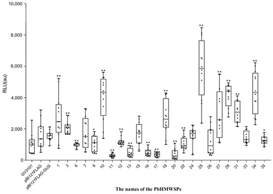 In order to study the roles of the above 30 PbHMWSPs in plant PTI, the fragments encoding the mature proteins (without signal peptides) of these PbHMWSPs were cloned (the gene sequences of the PbHMWSPs are shown in Table S3), and 24 of them were obtained. Then, the fragments encoding mature proteins were cloned into the plant expression vector pBI121flag and expressed in N. benthamiana by the A. tumefaciens-mediated transient expression system. RT-PCR was used to detect the expression level of these 24 PbHMWSPs, which showed that all of them were successfully expressed (Figure S2). After treatment with flg22, the reactive oxygen burst of the N. benthamiana leaves expressing PbHMWSPs was quantified. The N. benthamiana leaves expressing GUS were used as the controls. We first evaluated the effect of GUS on an flg22-triggered induced ROS burst; the max relative luminescence unit (RLU) values of N. benthamiana leaves expressing GUS were not significantly different from N. benthamiana leaves injected with either A. tumefaciens or with A. tumefaciens carrying the empty vector pBI121flag. This indicated that GUS expression did not affect the flg22-triggered ROS burst in N. benthamiana leaves. Compared with the N. benthamiana leaves expressing GUS, the maximum values of the relative luminescence units (RLUs) of N. benthamiana leaves that expressed ten PbHMWSPs (numbered 6, 8, 11, 12, 13, 16, 17, 20, 22, and 35) were significantly lower, while the maximum RLU values of N. benthamiana leaves expressing nine PbHMWSPs (numbered 1, 3, 10, 19, 25, 27, 28, 31, and 34) were significantly higher than that of the controls and the maximum RLU values of the remaining five PbHMWSPs were not significantly different to those of the controls (Figure 3). These results showed that the ROS burst was significantly suppressed in N. benthamiana leaves expressing ten PbHMWSPs and was induced in N. benthamiana leaves expressing nine PbHMWSPs. These results indicated that ten PbHMWSPs (numbered 6, 8, 11, 12, 13, 16, 17, 20, 22, and 35) could suppress flg22-mediated PTI.