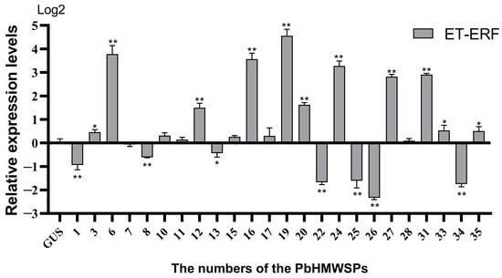 The relative expression of the ET pathway marker gene ERF after treatment with high-molecular-weight secretory proteins. The y axis represents the relative expression levels, and the x axis shows the numbers of the high-molecular-weight secreted proteins (PbHMWSPs). The data were analyzed with three independent repeated analyses, and the standard deviation is shown by the error bar. The GUS candidate effector was an empty vector without a flag fragment and served as a control. Statistically significant differences to the GUS are indicated (Student’s t-test: *, p < 0.05; **, p < 0.01).