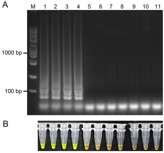 The LAMP reactions were performed in a 25 μL reaction mixture consisting of 2.5 µL of 10 × ThermoPol Buffer (Somersworth, NH, USA), 1.5 µL of 100 mM MgSO4, 3.5 µL of 10 mM dNTP mixture, 4 µL of 10 mM external primers (F3 and B3), 0.5 µL of 10 mM internal primers (FIP and BIP), 1 µL of Bst DNA Polymerase, Large Fragment (Nanjing Vazyme Biotech Co., Ltd., Nanjing, China), and 1 µL of DNA template, adjusted to a final volume of 25 μL with sterilized distillation-distillation H2O (ddH2O). To determine the optimal temperature and time of the LAMP reactions, the LAMP mixtures were incubated for 60 min at 55, 58, 60, 62, 65, 68, and 70 °C, and at 65 °C in a water bath for 15, 30, 45, 60, 75, and 90 min [34,35,37]. The reactions were terminated by heat inactivation at 95 °C for 2 min. Each product was confirmed by 2.0% agarose gel electrophoresis and photographed under a UV transilluminator. In addition, after the reactions, the LAMP products were directly observed by the unaided eye after the addition of 0.2 µL of SYBR Green I dye (10,000 × concentrate in DMSO, Coolaber, Beijing, China). With a positive reaction, the mixture was yellow-green in color, whereas with a negative reaction, the color of the mixture remained orange. The experiments were repeated three times.
