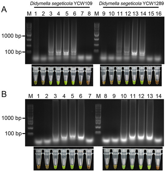 To optimize the LAMP reaction conditions, we carried out repeated assays using the genomic DNA of two D. segeticola isolates, YCW109 and YCW1289, as templates to determine the appropriate temperature and reaction time. A series of temperatures (55, 58, 60, 62, 65, 68, 70 °C) and durations (15, 30, 45, 60, 75, 90 min) were used for the LAMP assays according to previous methods. Ladder-like DNA fragments and discernible color changes were clearly observed in samples from both D. segeticola isolates heated at 60 °C to 68 °C for 60 min (Figure 2A). Similarly, positive reactions were clearly observed after 45–90 min of incubation at 65 °C. In addition, the ladder-like band was most clear at 65 °C and became more obvious after 60 min (Figure 2B). No ladder-like banding patterns with color changes were observed in the ddH2O control or other conditions. Thus, the LAMP assay applied for detecting D. segeticola was determined under the optimal conditions of 65 °C for 60 min.