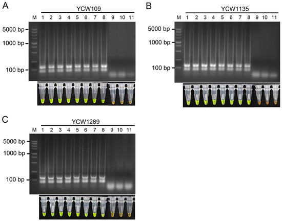 Sensitivity of the LAMP assay. Agarose gel electrophoresis and color changes of LAMP products with serially diluted genomic DNA (from 10 ng/µL to 10 ag/µL) from D. segeticola isolates YCW109 (A), YCW1135 (B), and YCW1289 (C) as templates. The detection limit was 1 fg/µL. The sensitivity of the assay was determined by the addition of SYBR Green I. The reactions were positive and presented a yellowish-green color. Lane 1, 10 ng/µL; Lane 2, 1 ng/µL; Lane 3, 100 pg/µL; Lane 4, 10 pg/µL; Lane 5, 1 pg/µL; Lane 6, 100 fg/µL; Lane 7, 10 fg/µL. Lane 8, 1 fg/µL; Lane 9, 100 ag/µL; Lane 10, 10 ag/µL; Lane 11, no-template (ddH2O) control. M, DL5000 DNA marker.