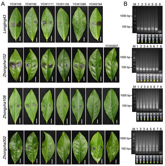 Healthy leaves were collected from 5-year-old tea plants of Camellia sinensis cv. Longjing43 (LJ43), cv. Zhongcha102 (ZC102), cv. Zhongcha108 (ZC108), and cv. Zhongcha302 (ZC302). Then, the leaves were surface-sterilized with 75% alcohol and washed with sterilized ddH2O twice. Tea plant leaves were air dried and subsequently inoculated with mycelial discs of D. segeticola isolates via the wound inoculation method [58]. A 5-mm mycelial disc from D. segeticola was placed on the wound on both sides of the main vein (left and right sides) and cultured for 48 h at 25 °C during the day and 20 °C at night, with cycles of 14 h of light and 10 h of darkness and a relative humidity of 80% [58]. Leaves of LJ43 inoculated with sterilized ddH2O were treated as the negative control. Each treatment with three biological replicates was repeated three times. After 3 days, genomic DNA was extracted from diseased leaves using a Genomic DNA Purification Kit (Sangon Biotechnology (Shanghai) Co., Ltd., Shanghai, China) according to the manufacturer’s protocol. The same method was used to extract genomic DNA from healthy leaves as the negative control. The LAMP assay was used to detect the presence or absence of D. segeticola in tea plant leaves.