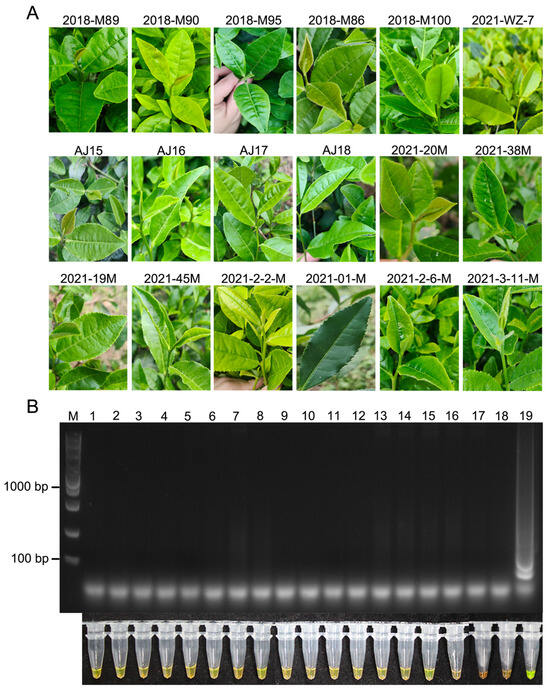 Detection of D. segeticola in healthy leaves of 18 germplasms of tea plants in the field. (A) Healthy leaves of different tea germplasms. (B) Agarose gel electrophoresis and color changes showing the LAMP results. Lane 1: 2018-M89; Lane 2: 2018-M90; Lane 3: 2018-M95; Lane 4: 2018-M86; Lane 5: 2018-M100; Lane 6: 2021-WZ-7; Lane 7: AJ15; Lane 8: AJ16; Lane 9: AJ17; Lane 10: AJ18; Lane 11: 2021-20M; Lane 12: 2021-38M; Lane 13: 2021-19M; Lane 14: 2021-45M; Lane 15: 2021-2-2-M; Lane 16: 2021-01-M; Lane 17: 2021-2-6-M; Lane 18: 2021-3-11-M; Lane 19: positive control (DNA extracted from diseased leaves of LJ43 inoculated with D. segeticola strain YCW2184). M, DL5000 DNA marker.