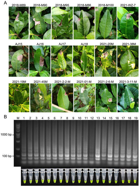 Detection of D. segeticola in diseased leaves of 18 germplasms of tea plants in the field. (A) Diseased leaves of different tea germplasms. (B) Agarose gel electrophoresis and color changes showing the LAMP results. Lane 1: 2018-M89; Lane 2: 2018-M90; Lane 3: 2018-M95; Lane 4: 2018-M86; Lane 5: 2018-M100; Lane 6: 2021-WZ-7; Lane 7: AJ15; Lane 8: AJ16; Lane 9: AJ17; Lane 10: AJ18; Lane 11: 2021-20M; Lane 12: 2021-38M; Lane 13: 2021-19M; Lane 14: 2021-45M; Lane 15: 2021-2-2-M; Lane 16: 2021-01-M; Lane 17: 2021-2-6-M; Lane 18: 2021-3-11-M; Lane 19: positive control (DNA extracted from diseased leaves of LJ43 inoculated with D. segeticola strain YCW2184). M, DL5000 DNA marker.